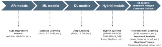 Timeline of adopted approaches for time-series analysis. AR: Auto-Regressive. ML: Machine Learning. DL: Deep Learning. RL: Reinforcement Learning. SVM: Support Vector Machine. RF: Random Forest. SVR: Support Vector Regression. ARIMA: Autoregressive Integrated Moving Average. GARCH: Generalized Autoregressive Conditional Heteroskedasticity. RNN: Recurrent Neural Network. LSTM: Long Short-Term Memory. SOM: Self-Organising Map.