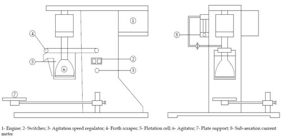 Flotation tests were conducted in a D12 multi-cell flotation cell of 2 L capacity, model XFD-II-3, motor power of 120 W and operating voltage of 400 V (Figure 2). The impeller speed was fixed at 1200 rev·min−1. For each test, a 500 g of mineral sample was dispersed in 2 L of water. After adjusting the suspension pH to 9.50 and addition of the depressant reagents, the suspension was conditioned for five minutes. The conditioning period lasted three more minutes when the collector was added. The flotation time was fixed at three minutes. The floated and unfloated fractions were collected and dried separately. The mass of solids in each fraction were determined accurately and used to calculate the recovery.