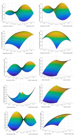 Figure 4 shows how each of the reagents influenced FMR inside the tested range. As can be seen, the variable that most influenced the FMR was the dosage of OA, achieving the maximum fluorite recovery at the top point of the reagent dosage. Accordingly, if the objective is to carry out a roughing of the starting mineral, the flotation with the largest value of OA must be carried out in order to achieve a sterile with the minimum fluorite grade. On the other hand, an excess of QT and SS inhibit FMR while PS and WD have a minimum at their center point being more economically viable to use a lower dosage of the two reagents.
