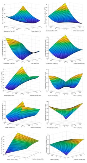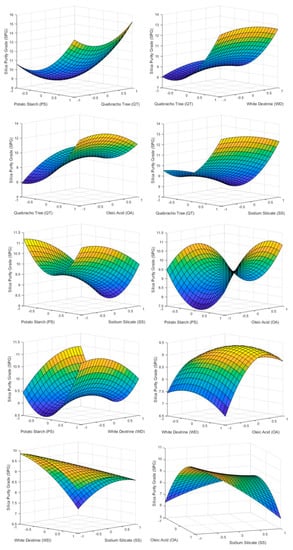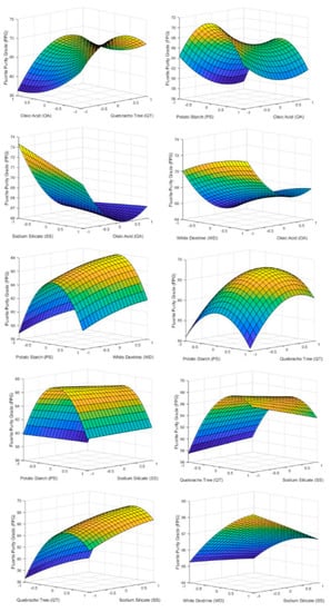 The influence of reagent on FPG is shown in Figure 5. It is observed that PS and QT reached a maximum close to their central point. On the other hand, WD and SS are the reagents whose variation influenced the FPG the least. The fact that WD did not have a considerable effect was due to the effect of PS [,]. PS, being a carbonate flocculant, inhibits the effect of WD as a dispersant due to the concentrations of PS used compared to WD.