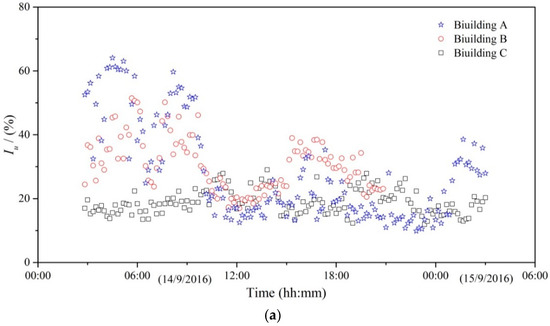 A comparison of the three high-rises in terms of turbulence in the along-wind and across-wind directions (Iu and Iv) is shown in Figure 6. Before 9:00 am on 14th September, the turbulence of buildings A and B was discrete, and the typhoon was far from the experimental building and had no effect on it at that time. The three high-rises had similar turbulence in the middle stage, but the turbulence of high-rise A increased in the late stage because the wind direction slowly moved northward, and a super high-rise is located north of high-rise A. This super high-rise produced an interference effect on the three high-rises.