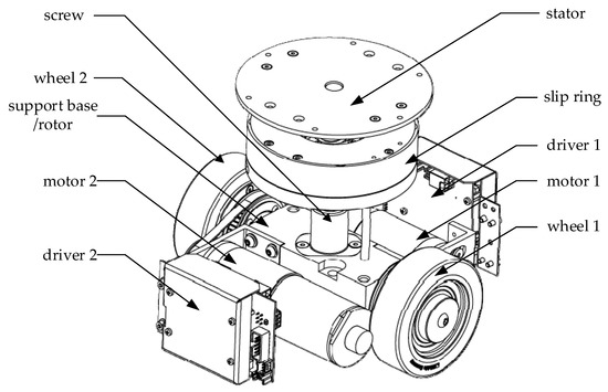 Each sub robot uses front and rear driving units and one driving unit consists of two DC motors, reducers and driving wheels. The power transmission sequence is: DC motor, planetary reducer, small timing pulley, timing belt, large timing pulley, and driving wheel. The slip ring is assembled to simplify wiring during the zero-radius turn of the driving units. The slip ring is divided into upper and lower parts: the upper part is the stator, and the lower part is the rotor. The stator is fixed with the integral support plate, and the rotor rotates together with the driving mechanism. Slip ring not only solves the problem of wiring of power and cable during the lifting and laying of the pallet, but also provides direction angle value for the front and rear driving units through the built-in multi-turn absolute encoder, which provides input for the nonlinear synchronization control in Section 3. It is known that the pitch, length and other parameters of the screw can lift the pallet up precisely to a certain height by controlling the number of wheel rotations of the driving units. Since the screw has a self-holding characteristic, the pallet does not fall down by itself even though power outage may occur unexpectedly. The compact driving unit is shown in Figure 1.