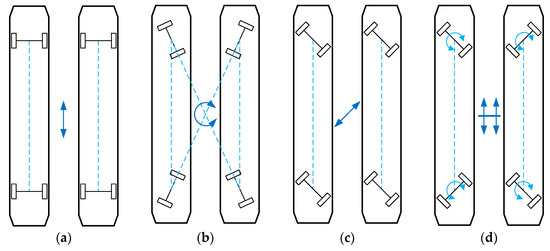 Analysis of motion model. (a) Forwards/Backwards; (b) Rotation; (c) Sideways/crab motion; (d) Lifting and laying.