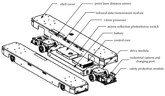 The main components of master-slave separate parallel intelligent mobile robot are: driving units, control and power supply modules, sensor modules, shell cover and safety protection modules, as shown in Figure 3. The individual modules of the sub robot are mechanically independent but electrically connected to each other. Each sub robot consists of two driving units, two safety protection modules, two sensor modules, and control and power supply modules with the cover. Safety sensors and infrared data transmission module are installed around the sides of each sub robot. The shell cover is the mounting base, and each module is mounted on the cover by a cross recessed countersunk head screw.