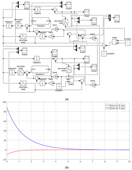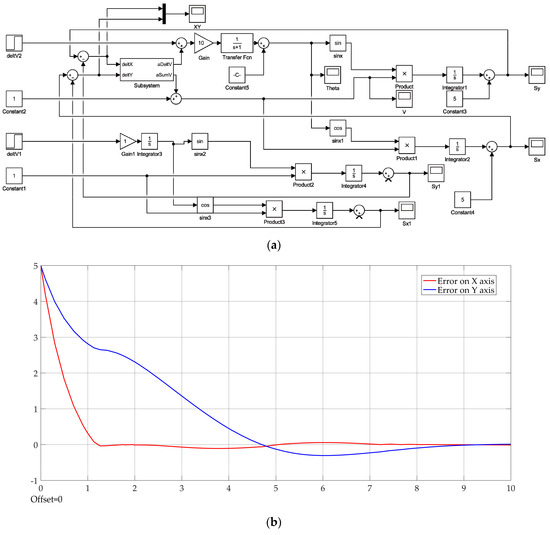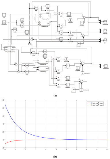 The simulation in Simulink and convergence of results for oblique linear motion. (a) Simulink simulative model graph; (b) The model reaches a steady convergent state.