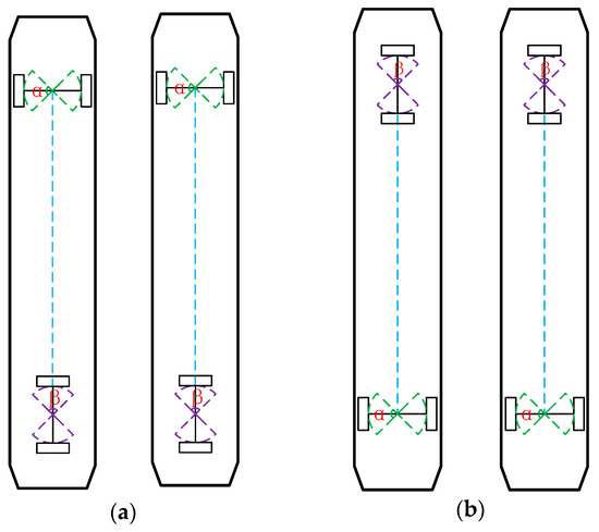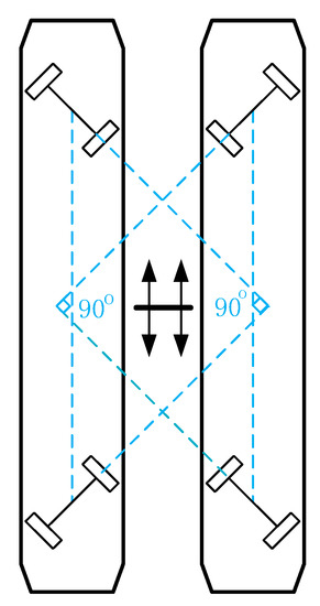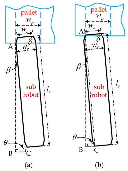 In order to lift the pallet up, the sub robot should move underneath the pallets accurately and safely. In the ideal case, the shell cover of the sub robot won’t collide with the edge of the free entry of the pallets, as shown in Figure 9a. represents the intersection angle of the sub robot and the free entry of the pallet.