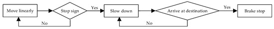 As mentioned above, master robot only needs to move according to the driving task demands. Therefore, PID control strategy is suitable for master robot to move to the destination or lift up and lay down the pallet by controlling its driving motors. What is more, in simulation diagram, module “Constant” means setting trajectory, and “Integrator” means that the odometer is the integral result of velocity and time. In “Control section”, the speeds of the two driving units are adjusted dynamically based on the position feedback. Because the system is an open loop including integral part, a proportional part in feedback control can make master robot motion system gradually stable. Control strategy of master robot motion is shown in Figure 4.