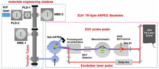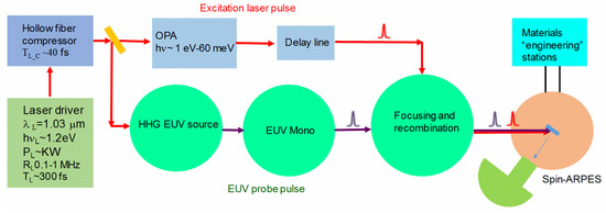 The paper describes the beamline components shown schematically in Figure 1 and Figure 2: TiS laser-driver with ~50 fs pulse duration, 4 W average power and 1 kHz repetition rate (Section 2); HHG EUV Source generating photons with energies >75 eV, with maximum flux of single harmonic >1011 photons/second (ph/s), ~50 fs pulse duration (>108 ph/pulse/harmonic) (Section 3); EUV Off-Plane Mounting (OPM) monochromator preserving the pulse duration (Section 4); Focusing and recombination of the EUV and excitation pulses. The excitation and EUV pulses are focused on the same focal spot on the sample material (Section 5). The sample material is mounted on a five-axis manipulator with liquid helium cooling for Spin-ARPES measurements (Section 6); Ultrafast materials engineering stations: MBE and PLD growing the new, ultrafast sample materials. The stations are connected by fast and contamination free UHV transfer tubes to the TR-Spin-ARPES spectrometer (Section 7). Section 8 describes the beamline characterization. Section 9 describes measurements of static and time-resolved ARPES. Finally, Section 10 describes the possible EUV beamline scaling reduction of data acquisition time. This could be achieved by upgrading the laser driver from the 4 W, 1 kHz Ti: Sapphire to the new femtosecond fiber laser with ~kW average power, and MHz repetition rate, resulting in over two orders of magnitude reduction of data acquisition time.