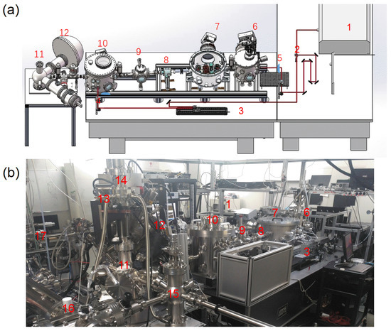 The EUV Beamline: (a) engineering drawing and (b) laboratory picture. (1) TiS laser driver; (2) Laser beam-splitter; (3) Delay line; (4) Focusing lens for excitation pulse); (5) Focusing lens for HHG; (6) HHG EUV source; (7) EUV monochromator; (8) monochromator exit slit; (9) EUV detector chamber; (10) Focusing and recombination chamber; (11) Spin-ARPES spectrometer chamber; (12) Spin-ARPES hemispherical analyzer; (13) Liquid Helium cooling pipes; (14) 4-axis manipulator for sample; (15) Load lock for sample material; (16) Transfer tube bringing sample material from materials engineering stations; (17) MBE-2 materials engineering station.