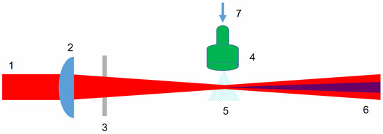 Schematic of the HHG EUV source: (1) input laser pulse; (2) focusing lens; (3) entrance windows with anti-reflective (AR) coating; (4) gas nozzle; (5) HHG EUV source; (6) EUV and laser output to monochromator; and (7) gas input pipe.