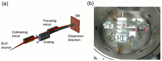 EUV monochromator. (a) off plane mount geometry; (b) laboratory picture: (1) toroidal mirrors; (2) gratings mounted on translation stage; (3) grating rotation stage.