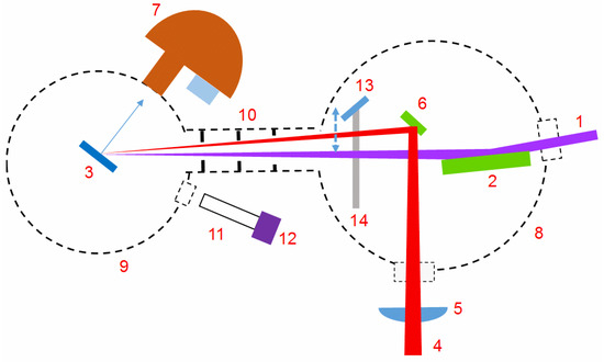 The optical diagram of focusing and recombination chamber: (1) EUV pulse from the monochromator; (2) EUV focusing toroidal mirror on a 5-axis stage; (3) sample materials or CE:YAG crystal; (4) Excitation laser pulse (ELP) from the variable delay line (VDL); (5) AR-coated plano convex lens with a focal length of f = 1.3 m. (6) The D-shaped re-combination mirror, reflecting ELP; (7) Spin-ARPES detector; (8) Focusing and recombination chamber; (9) Spin-ARPES vacuum chamber; (10) Differential pumping system with three pinholes; (11) Telescope; (12) CCD camera; (13) Plane golden mirror for observing the overlapping of two beams; (14) Linear stage.