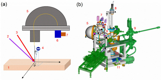 Angle Resolved Photo-emission Spectrometer (ARPES): (a) schematic and (b) engineering drawing. (1) sample material to be analyzed; (2) EUV pulse; (3) excitation laser pulse (ELP); (4) photo-electron (PE); (5) Hemispherical electron analyzer; (6) ARPES detector with multichannel plate (MCP), phosphor screen, telescope and CCD camera; (7) Spin-spectrometer with Mott spin detector; (8) sample material manipulator with five axes and liquid He cooling; (9) load lock for inserting sample material into the ARPES chamber; (10) ultra-high vacuum (UHV) ion pump; (11) XYZ fine mechanical adjustment for positioning the center of the ARPES chamber exactly in the focal-point of the EUV toroidal mirror.