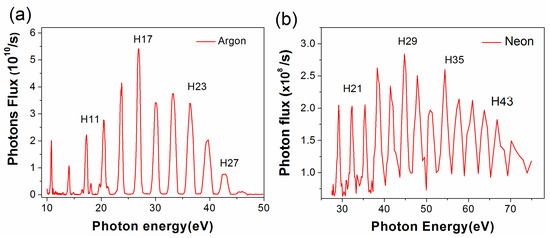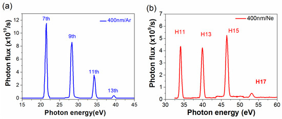 The HHG EUV spectra of Ar and Ne were also produced with 400-nm driving laser pulses [47]. The 1.2-mJ 400 nm pulses are obtained through second harmonic generation of fundamental laser and then focused on the gas jet with a f = 300 mm lens. Figure 8a shows the HHG spectrum in Ar, which has a maximum photon flux of 1.2 × 1011 ph/s at H7 (21.7 eV). Figure 8b shows the HHG spectrum in Ne, with a maximum photon flux of 5.5 × 109 ph/s at H15 (46.5 eV). The EUV source excited by 400-nm laser can emit higher photon flux, due to the wavelength-scaling effect, and also provide higher energy resolution, which is useful for TR-Spin-ARPES measurements. The spacing between harmonics is increased (Figure 8). Ref. [48] takes advantage of this larger spectral spacing to replace the monochromator with an Al filter which transmits mainly H7 (21.7 eV) with bandwidth of ~150 meV.