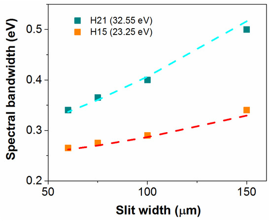 Photo-electron spectroscopy requires a narrow spectral bandwidth of the EUV radiation. The spectral profile at the output of the monochromator depends on the size of the HHG source, on the monochromator instrumental response (i.e., the bandwidth transmitted through the slit) and on the intrinsic bandwidth of the harmonics. If the intrinsic bandwidth of the harmonics is lower than the bandwidth transmitted through the monochromator, the energy resolution is limited by the source itself. In this case, the monochromator is acting as a broadband filter that is used to select a single harmonic and filter out all the adjacent harmonics. On the other side, if the transmitted bandwidth is lower than the bandwidth of the harmonics, the monochromator, as well as filtering out all the adjacent harmonics, is also selecting a spectral portion of the single harmonic.