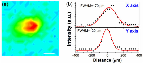 EUV spot size measurement (a) CCD image of the fluorescence of the CE:YAG crystal, irradiated with EUV beam; scale bar is 100 μm; (b) the measured focal spot profiles Dx−FWHM ~ 170 μm and Dy−FWHM ~ 120 μm.