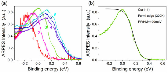 ARPES spectra of the Fermi edge of Cu (111) as a function of incident EUV flux on the sample material. EUV photon energy H13 (20.15 eV); monochromator grating G2 and slit width = 100 μm. (a) spectra measured with the following EUV photon fluxes (ph/s): (1) 6 × 108; (2) 1.5 × 109; (3) 3.6 × 109; (4) 4.8 × 109; (5) 5.28 × 109; (6) 5.68 × 109; (b) the Fermi edge measured with photon flux ~3.6 × 109 ph/s, corresponding to a pulse photon density ~180 (ph/μm2). The black fitting curve has a FWHM = 190 meV.