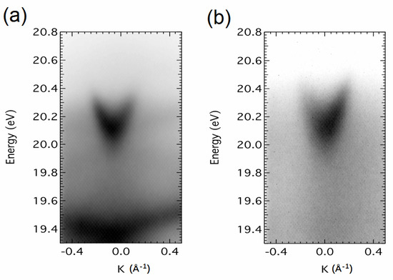 Except for the investigation of space charge effect, static ARPES spectra of single-crystal copper were also measured at room temperature, using the EUV beamline with photon energy H13 (20.15 eV). The EUV photon flux was adjusted to ~6 × 108 ph/s and the EUV spot area at the sample was 170 μm × 120 μm. Grating G2 was used and the silt width was Ws = 100 μm. The exposure time for acquiring data was ~20 min. Figure 12a shows a snapshot of the Shockley surface state of Cu (111), along Г–K direction in the surface Brillouin zone. For comparison, Figure 12b shows the similar ARPES image obtained with radiation from an He-I discharge lamp (21.22 eV).