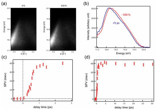 Figure 13a shows the ARPES spectra of the valence band of GaAs (100) at time zero (left image) and at time delay +650 fs (right image) after the excitation laser pulse. To further distinguish the influence of excitation pulse on the ARPES spectra, two typical electron Energy Distribution Curves (EDC) are plotted in Figure 13b, for two time delays: −500 fs (before excitation) and +5 ps (after excitation). It is clearly observed that the peak position of EDC is shifted to the higher kinetic energy side when the EUV probe pulse arrives at the sample after the excitation. We attributed this up-shifting phenomenon to the Surface Photo-Voltaic (SPV) effect. In general, the downward band bending on the p-type semiconductor can trap photo-excited electrons at the surface and drive photo-excited holes into the bulk. Such electron-hole separation could produce additional electric flied to transiently shift the band structure up in energy [49,50].