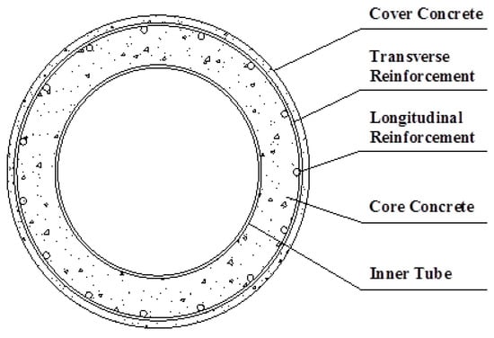 The steel-composite hollow reinforced concrete (RC) column was proposed by Han et al. [4]. That study aimed to prevent the occurrence of brittle failure in a hollow RC column. It featured an inner tube that reinforced the inner face of the hollow RC column, which is shown in Figure 1. This offered strong and durable confinement, because of the reinforcement provided by the inner tube. The column’s strength and ductility were enhanced, because of the continuous confinement stress provided by the inner tube. This column had cover concrete on its outside but the hollow section don’t has cover concrete by the inner tube. The strength and ductility of the columns were enhanced by the continuous confining stress provided by the inner tube. The confinement of normal-strength concrete (NSC) for steel-composite hollow RC columns has been studied in the last few years [4,5,6,7]. Stress–strain models for confined concrete have been proposed based on the material model created by Mander [8] (Han et al. [4]). A nonlinear concrete model and a compressive strength model with normal-strength concrete were studied in experiments evaluating its column [6,7]. Won et al. [5] studied the optimal confining stress on the core concrete through finite element analysis. Based on Mander’s material model [8], these studies proposed a material model and applied it in evaluating composite hollow RC columns. However, if the strength of the concrete is increased, the proposed material model and analysis method may not be suitable, because Mander’s material model [8] was proposed for a column with normal-strength concrete.