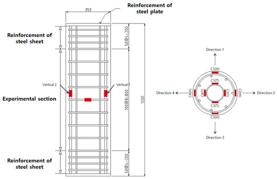 The specimens in groups 2–5 were made of concrete with a specified strength of 50 MPa. Normal-strength concrete was applied to the inner tube of group 1, which was subsequently compared to HSC specimens. To ensure that failure would occur in the region at the center of the column, both sides of the columns were reinforced with a bolted steel sheet made from a steel plate of 20 mm. Figure 2 shows the dimensions of the test specimens and strain gauges. The height of the specimens was 1200 mm and the experimental region at the column had a length of 800 mm. The diameter of the column was 350 mm. The strain gauges were attached at the transverse and longitudinal reinforcements in the inner tube.
