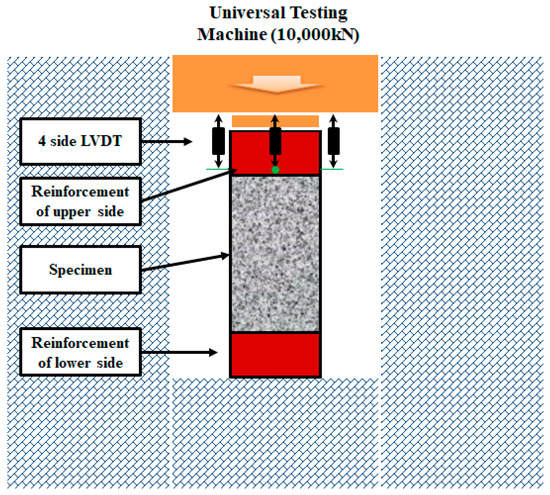 Figure 3 shows a diagram of the experimental setup. The test specimens were loaded on a rigid hydraulic press with load control capabilities at a maximum compressive load of 10,000 kN. The axial displacement was measured using four linear variable differential transformers (LVDTs) located at the four corners of the columns and attached to the top, which is shown in Figure 3.