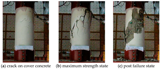 Figure 5 shows Specimen HSC-HS_130 at different loading stages. During the ascending part of loading, cracks appeared in the concrete cover after the load exceeded the maximum strength of the column. The cover concrete became suddenly separated at the initial load level. After the crack occurred in the cover concrete on the loading side with an increase in compressive concentric loading, the crack propagated at an angle of 45°.