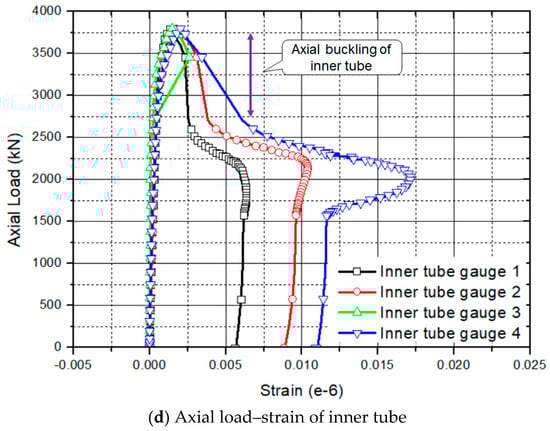 In general, the strength of the RC column with HSC decreased after it reached its maximum strength. On the contrary, the steel-composite hollow RC column had a bifurcation point (3), as shown in Figure 6a. This phenomenon occurred due to the resistance after the buckling of inner tube, as shown in Figure 6d. This column had 65% of the maximum strength after the inner steel tube collapsed.