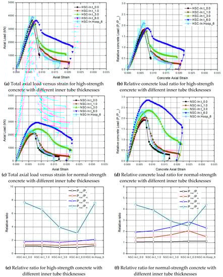 Figure 8 shows the stress–strain curves of the confined concrete according to concrete compressive strength. The relative ratio between the strength of the core concrete and maximum strength gains was found to be 1.7, 1.8, 1.6, and 2.2 in the high-strength specimens. Furthermore, the strength of the NSC specimen increased by 1.95, 2.1, 2.4, 2.7, and 2.3. The inner tube thickness affects the confining effect of the core concrete in the normal-strength concrete analysis model, which is shown in Figure 8f. On the other hand, the ratio of the HSC model does not stay at a similar value depending on the thickness of the inner tube, which is shown in Figure 8e. With an increase in the inner tube thickness, the relative ratio between the maximum strength of the column and the strength of the steel components was reduced. The HSC had less lateral expansion under axial compression than normal-strength concrete because of its higher elastic modulus and its lower chance of internal micro-cracking. As a result, the efficiency of the passive confinement of high-strength concrete decreased more as compared to normal-strength concrete. An increase in the thickness of the inner tube resulted in an enhancement in the confinement effect of the core concrete due to the inner tube confining the core concrete in tri-axial directions. Furthermore, the ductility of the column improved with an increase in the inner tube thickness.