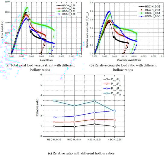 Figure 9 illustrates the experimental stress–strain curves and the effect of the hollow ratio. This ranged from 0.36 to 0.58. The ratio of was in the range of 0.9–1.2 with an average of 1.0. The strength of the confined core concrete increased to 1.8, 2.0, 2.26, and 2.5. The test results indicated that the relative concrete load ratio was enhanced with an increase in the hollow ratio, which is shown in Figure 9c.