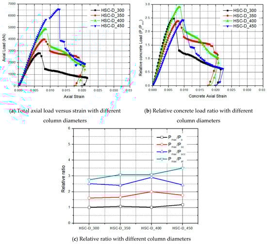 Figure 10 shows the experimental stress–strain curves and confined concrete effects when the column diameter changed from 300 mm to 450 mm. The total axial load was enhanced with an increase in the column diameter, as shown in Figure 10a. The effect of confined concrete increased from 2.5 to 3, as shown in Figure 10b,c. The ratio, strength of core concrete, and maximum strength of column changed, as shown in Figure 10c. The confining effect of the 400 mm diameter model was high only because it did not cause transverse reinforcements loosening. The specimens with column diameters of 300 mm, 350 mm, and 450 mm had poor confinement effects due to loose transverse reinforcement packing. The confinement effect from the change in diameter was estimated continuously.