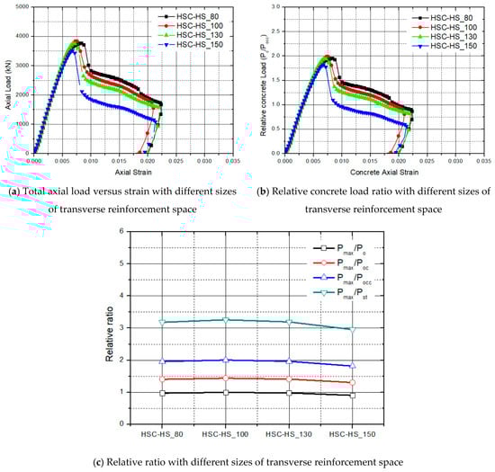 In general, the lateral confining press imposed on the concrete core is directly related to the amount of lateral reinforcement applied. Thus, a large confining pressure applied to the concrete core will result in better confinement efficiency. To investigate this effect, an experimental study was performed with a different number of lateral reinforcements, as shown in Figure 11. The size of the transverse reinforcement space ranged from 80 to 150 mm. As a result, the confined effect of the core concrete from a different number of lateral reinforcements did not increase, as shown in Figure 11c in the HSC test model. The buckling of the longitudinal reinforcement and steel inner tube occurred due to the wide transverse reinforcement spaces. The number of transverse reinforcements, which needs to be economical, must be determined to increase the confining effect.