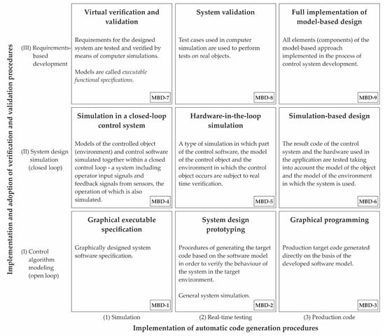 In Reference [7], the nine-box model of immersion in the Model-Based Design process of control algorithm development is presented (Figure 1). The companies with the highest degree of immersion (Figure 1 MBD-9) employ a fully model-based approach during the research and development phase. The bare minimum, however, is to use a graphical representation of the developed control system components (Figure 1 MBD-1).