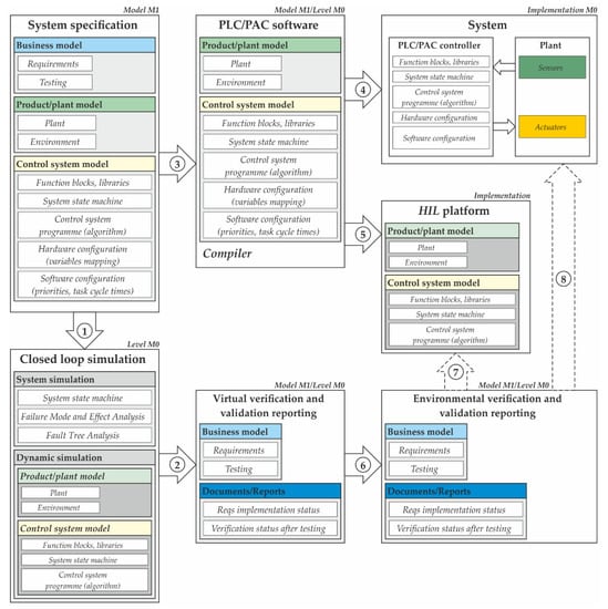 The fully-featured (ideal) Model-Based Design framework/toolchain/workflow. (1) automatic generation of simulation files [20,24,25]; (2) generating documentation from simulation tests; (3) automatic code generation for PLC/PAC [23,26,27]; (4) programming the control platform; (5) Hardware-In-the-Loop testing [28,29,30]; (6) virtual testing used to validate of the solution [7,18]; (7,8) conducting real-time testing for final system approval.