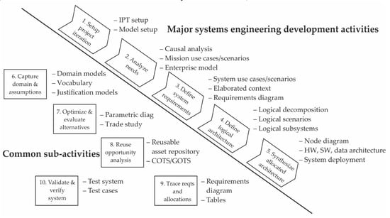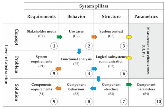 INCOSE OOSEM supports identifying risks and potential problems at the early project stages. Steps 1–5 (Figure 3) define the most important modelling stages necessary to fully describe the project and architecture of the implemented solution. These steps are usually the most time and resource consuming among the entire project. Steps 6–10 (Figure 3) are practices and activities conducted during modelling and system development.