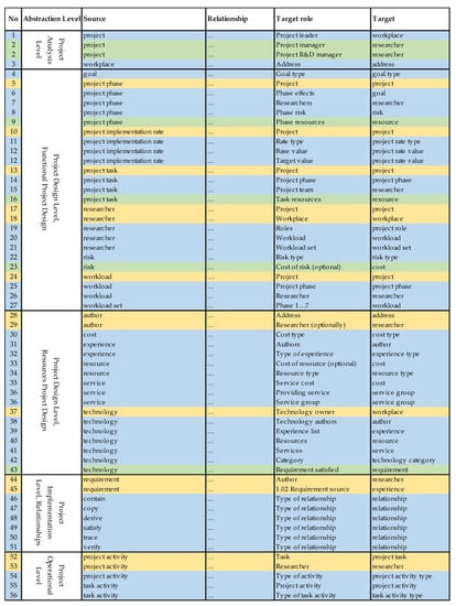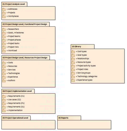 - Requirements modelling—requirements set for the system; a fusion of the adopted business model, law regulations and identified functionalities that are necessary to meet the project’s objectives and business goals [4,14,15];