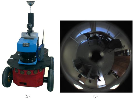 Despite stereo cameras permitting measuring depth from the images, these systems present a limitation related to their field of view. In order to obtain complete information from the environment, several images must be captured. In this respect, omnidirectional cameras constitute a good alternative. They can provide a big amount of information with a field of view of 360 deg. around them, and their cost is relatively low in comparison with other kinds of sensors. Furthermore, omnidirectional vision systems present further advantages. For instance, the features in the images are more stable (because they stay longer as the robot moves), and they permit estimating both the position and the orientation of the robot. Omnidirectional cameras have been successfully used by different authors for mapping and localization [,,,,]. A wide study was carried out by Payá et al. [], who introduced a state-of-the-art of the most relevant mapping and localization algorithms developed with omnidirectional visual information. An example of a mobile robot that has an omnidirectional camera mounted on it is shown in Figure 1a, and an example of an omnidirectional image is shown in Figure 1b.