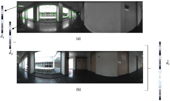 Visual mapping and localization have been solved mainly by using two main approaches to extract the most relevant information from scenes; either by detection, description, and tracking of some relevant landmarks or working with global appearance algorithms, i.e., building a unique descriptor per image. On the one hand, the methods based on local features consist of extracting some outstanding points from each scene and creating a descriptor for each point, using the information around it (Figure 2a). The most popular description methods used for this purpose are SIFT (Scale-Invariant Feature Transform) [] and SURF (Speeded-Up Robust Features) []. More recently, descriptors such as BRIEF (Binary Robust Independent Elementary Features) [] or ORB (Oriented FAST and Rotated BRIEF) [] have been proposed, trying to overcome some drawbacks such as the computational time and invariance against rotation. These descriptors have become very popular in visual mapping and localization, and many authors have proposed methods that use them, such as Angeli et al., who employed SIFT [], or Murillo et al., who used SURF []. Nonetheless, these methods present some disadvantages. For instance, to obtain reliable landmarks, the environments must be rich in details. Furthermore, keypoints’ detection is not always robust against changes in the environments (e.g., changes of lighting conditions), and sometimes, the description is not totally invariant to changes in the robot position. Moreover, these approaches might be computationally complex; hence, in those cases, it would not be possible to build models in real time. On the other hand, the methods based on the global appearance of scenes consist of treating each image as a whole. Each image is represented by a unique descriptor, which contains information about its global appearance (Figure 2b). These methods lead to simpler mapping and localization algorithms, due to the fact that each scene is described by only one descriptor. Hence, mapping and localization can be carried out by just storing and comparing the descriptors pairwise. Besides, they could be more robust in dynamic and unstructured environments. However, as drawbacks, these methods present a lack of metric information (they are commonly employed to build topological maps). Visual aliasing also might have a negative impact on the mapping and localization tasks, due to the fact that indoor environments are prone to present repetitive visual structures. Additionally, modelling large environments would require a big amount of images, and this can introduce serious issues when these techniques have to be used in real-time applications. Therefore, global appearance is an intuitive alternative to solve the mapping and localization problem, but its robustness against these issues must be tested. Many authors have addressed mapping and localization using global appearance descriptors (Figure 2b). For instance, Menegatti et al. [] used the Fourier signature in order to build a visual memory of a relatively small environment from a set of panoramic images. Liu et al. [] proposed a descriptor based on colour features and geometric information. Through this descriptor, a topological map can be built. Payá et al. [] proposed a mapping method from global appearance and solved the localization in a probabilistic fashion, using a Monte Carlo approach. Furthermore, they developed a comparative analysis of some description methods. Rituerto et al. [] proposed the use of the descriptor gist [,] to create topological maps from omnidirectional images. More recently, Berenguer et al. [] proposed the Radon transform [] as the global appearance descriptor of omnidirectional images and a hierarchical localization method. Through this method, first, a rough localization is obtained; after that, a local topological map of a region is created and used to refine the localization of the robot.