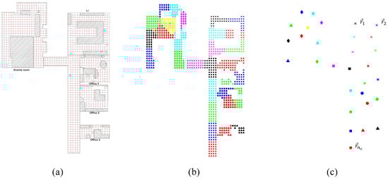 Example of an indoor map and a compression of the information. (a) Positions where the images were captured. (b) Result of the clustering process. (c) Each cluster is reduced to one representative.