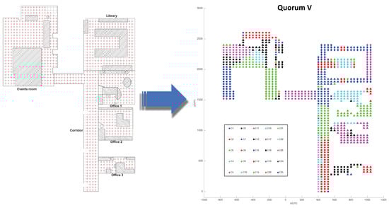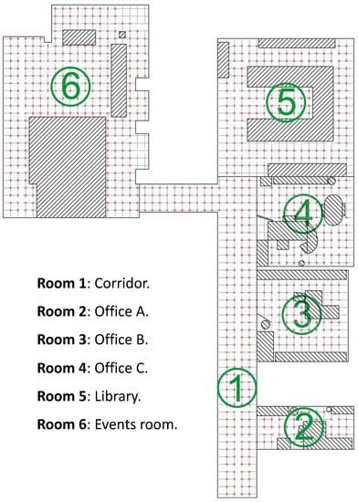 Two different types of datasets were used to develop the experiments; QuorumV, which contains grid-distributed visual data, and the COsy Localization Database (COLD), which contains visual information along a trajectory. On the one hand, Quorum V is a publicly-available dataset [], which consists of a set of omnidirectional images that have been captured in an indoor environment at Miguel Hernandez University (Spain). The database includes 3 offices, a library, a meeting room, and a corridor. It is composed by two datasets; the first one is a training dataset, and it is composed of 872 images, which were captured on a dense cm grid of points. As for the second dataset, the test dataset, it is composed of 77 images, which were captured in different parts of the environment, in half-way positions among the points of the training dataset, and including changes in the environment (e.g., people walking, position of furniture, etc.). Figure 4 shows the bird’s eye view of theQuorum V database and the grid points captured by the robot for the training dataset.