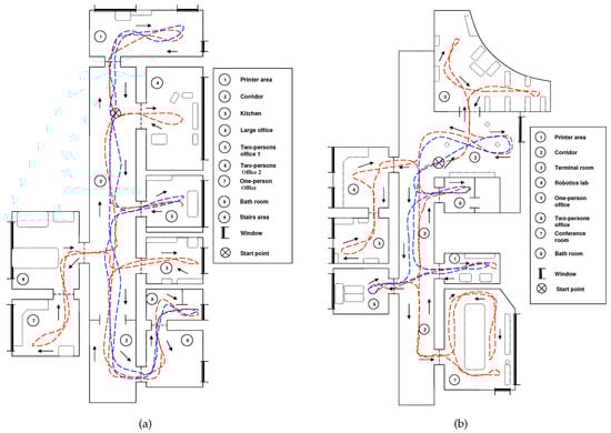 Bird’s eye view of the COsy Localization Database (COLD). (a) Freiburg and (b) Saarbrücken environment. Extracted from https://www.nada.kth.se/cas/COLD/.