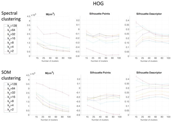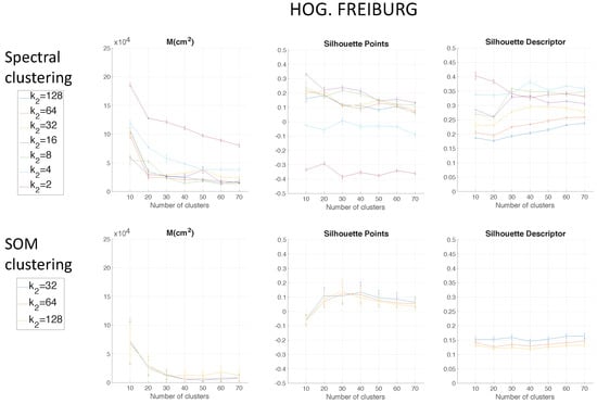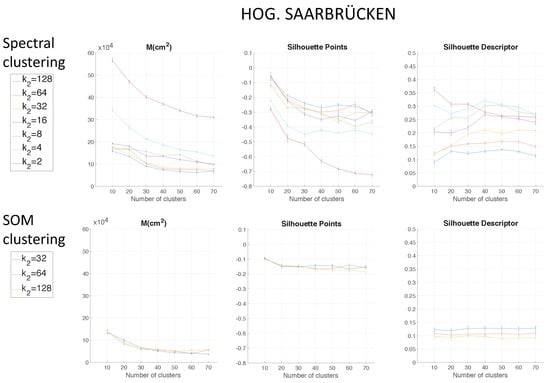 This section focuses on the evaluation of clustering methods to compact the information contained in a set of global appearance descriptors. To carry out the experiments, two clustering methods were studied for each environment, and three global appearance descriptors were considered. The first method (Method 1) consists of spectral clustering along with k-means as was explained in Section 3.1. Other configurations were tested, such as to use of SOM instead of k-means to solve Step 5 of the spectral clustering, but the results were quite similar; thus, only the spectral clustering along with k-means to cluster the normalized matrix of the eigenvectors is shown. The second method (Method 2) consists of the use of SOM, which was explained in Section 3.2. Therefore, for the two proposed methods, several experiments were carried out to study the influence of the parameters of the three global appearance descriptors. Table 2 summarizes the experiments developed.