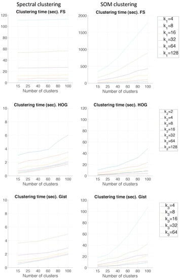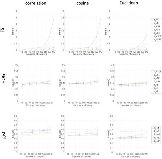 Results of the localization process with FS, HOG, and gist used to describe the representatives of the clusters and the test images: average computing time vs. number of clusters. Quorum V environment.