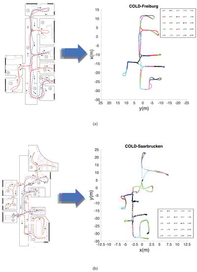 On the other hand, COLD (COsy Localization Database) [] (also publicly available) contains several sets of images captured in three different indoor environments, which are located in three different cities: Ljubliana (Slovenia), Saarbrücken, and Freiburg (Germany). This database contains omnidirectional images captured while the robot traversed several paths within the environments under real operating conditions (with people that appear and disappear from scenes, changes in the furniture, etc.). In the present work, we use the two longest paths: Saarbrücken and Freiburg. Both datasets include several rooms such as corridors, personal offices, printer areas, kitchens, bathrooms, etc. In order to represent the same distance between images as the distance presented in the Quorum V database, a downsampling is carried out to obtain an acquisition distance between images of 40 cm approximately. Therefore, two training datasets are generated: and , with 519 and 566 images, respectively. Moreover, from the remaining images, test datasets were created. Figure 5 shows the bird’s eye view of the environments and the path that the robot traversed to obtain the images. To summarize, Table 1 shows the datasets used for this work and the number of images that each of them contains.