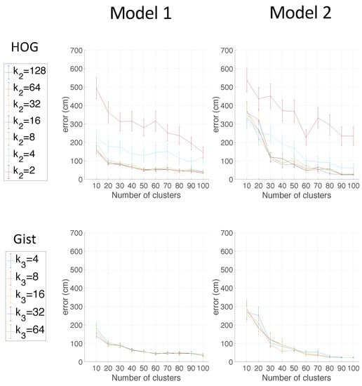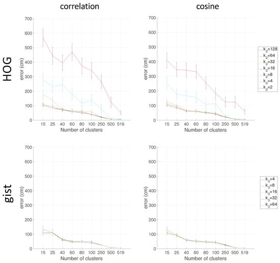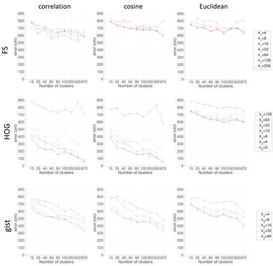 The FS descriptor is not good for localization since the best choice (correlation distance) presents errors between 650 cm and 800 cm depending on the number of clusters and the size of the descriptor. HOG clearly improves the localization task. Except for the case , the average localization error decreases as the number of clusters increases, and these values go from 500 cm when is low and achieve values under 100 cm (when is high). As for the gist descriptor, it also produces relatively good results, but they are not as good as those obtained through the use of HOG. The localization task achieves the best results when the correlation distance is used.