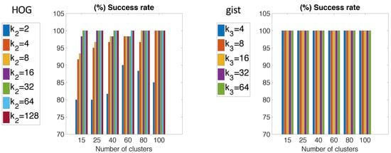 By and large, the correct environment selection is almost always done. Many cases are given in which 100% success is reached, whereas the worst cases do not present a success rate under 75%. If the environment selection is carried out with HOG, results depend substantially on the chosen value. For instance, the worst cases are presented for . However, for , 100% success is reached. Through the use of gist descriptor, 100% success is given independently of the number of clusters or the value.