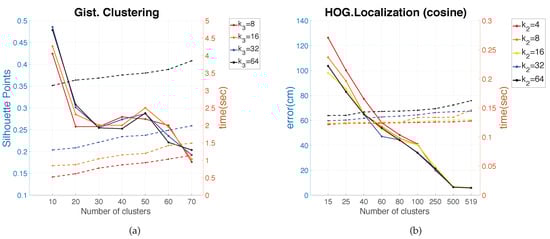 Best results of the clustering and localization processes. (a) Clustering with gist and spectral clustering: silhouette of points (left axis, solid lines) and computing time (right axis, dashed lines) vs. number of clusters. (b) Localization with HOG and cosine distance: average localization error (cm) (left axis, solid lines) and computing time (right axis, dashed lines) vs. the number of clusters. Freiburg environment.