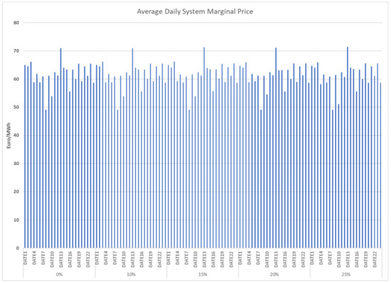 The weighted average annual System Marginal price for different share level of the bilateral contracts is almost identical in the examined cases, as it is estimated to be 63.11, 63.12, 63.16, 63.12, and 63.06 €/MWh for 0%, 10%, 15%, 20%, and 25%, respectively. Figure 2 provides the average daily System Marginal price for the different typical days and the different share level of the bilateral contracts, which again depicts that results are identical for the typical days in all months.