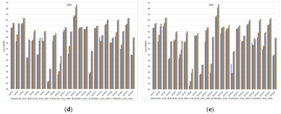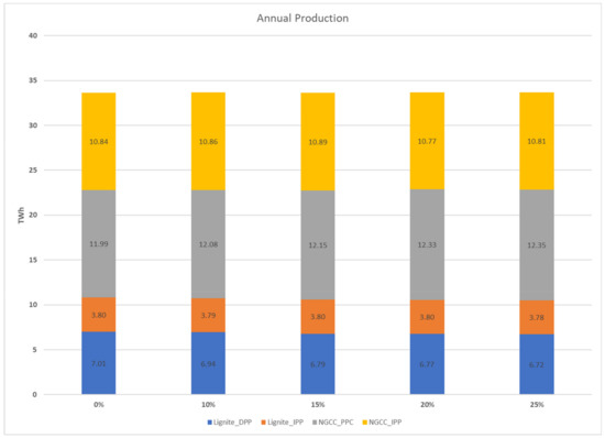 Figure 3 provides the annual production (in TWh) per Producer and Fuel type, for different share level of the bilateral contracts (10%, 15%, 20%, and 25%). Figure 4 provides the evolution of wholesale price for different scenarios (units that participate in the bilateral contracts), different dates, and different level of bilateral contracts (10%, 15%, 20%, and 25%). The different scenarios concern a different number of thermal units from the PPC that participate in the bilateral contracts, i.e., BLOCKS_5LIG, BLOCKS_5LIG_3NG mean that five lignite or five lignite and three natural gas units participate, while the remaining capacity is bid with block orders types. On the contrary HOURLY, concern participation in the energy exchange with hourly orders. The impact of hourly and block order types has been thoroughly examined in the recent paper [15].