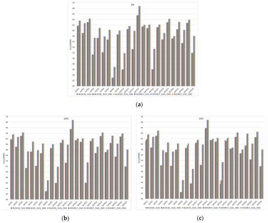 The adopted methodology enables the examination of the impact of bilateral contracts of the wholesale markets. The Public Power Corporation (PPC) represents about 90% during off-peak hours (1–8), which determines the minimum load that will be covered by bilateral contracts. This leads at about three up to nine PPC thermal units to operate for meeting bilateral contracts, in case of low load/10% and high load/25% respectively. Besides this deviation in the committed units, the results both in the prices and energy mix are not strongly influenced. This is attributed to the fact that the new market algorithm on the voluntary energy exchange [15] enables bidding for thermal units below variable cost. The main reasoning behind that, besides the liberal assumption that every participant can adopt its strategy without constraints, is that thermal units in the European target model cannot remunerate shut-down costs through supplementary mechanisms that existed in the mandatory pool. This fact, in practice, enables PPC, as well as all thermal units, to dispatch their technical minimum with limited risk, as the remuneration of shutdown costs is difficult from the day-ahead, intra-day, and balancing markets. This is exceptionally difficult for lignite-fired units that have a high shut-down cost, as well as a long-time for the (de)synchronization of the units in case of start-up/shut-down respectively. Therefore, unless there is a specific regulatory decision on limitations in the bidding of thermal units, the dispatch of units is not strongly influenced by the introduction of bilateral contracts. In fact, the impact on the wholesale price is negligible, as the differences at the annual level are within 0.1 €/MWh. Moreover, the non-linear evolution of SMP, as shown is Figure 2 (where the case of 15% has higher SMP compared to other cases) results from the conditions of specific dates and availability of units, which is negligible to enable the provision of a conclusion that this constitutes as an optimum level of bilateral contacts.